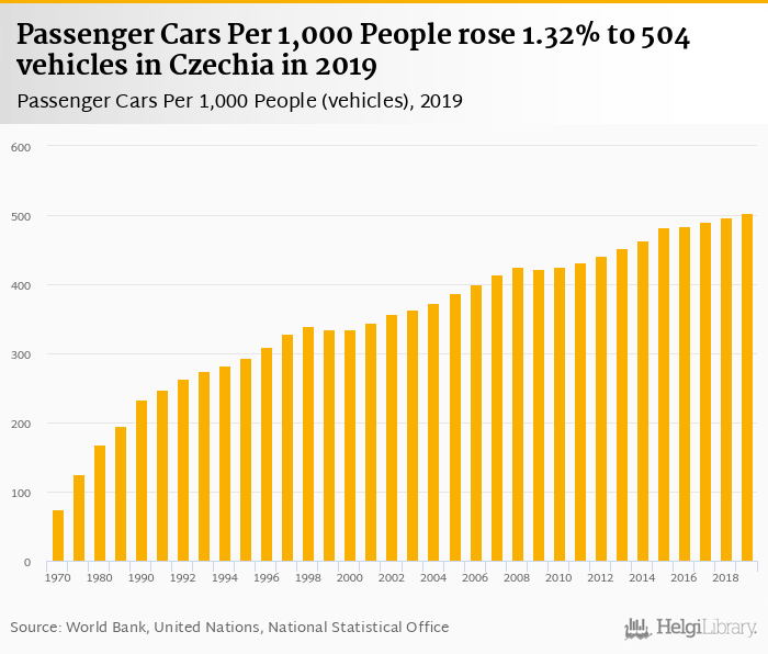 Passenger cars per 1,000 people rose 1.32% to 504 vehicles in the Czech Republic in 2019, according to the National Statistical Office.