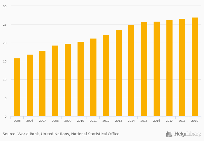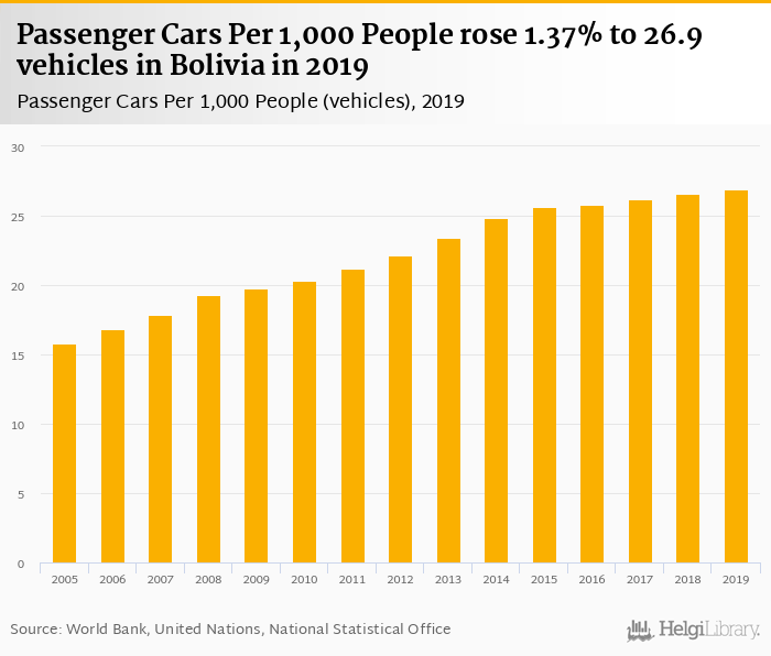 Passenger cars per 1,000 people rose 1.37% to 26.9 vehicles in Bolivia in 2019, according to the National Statistical Office.