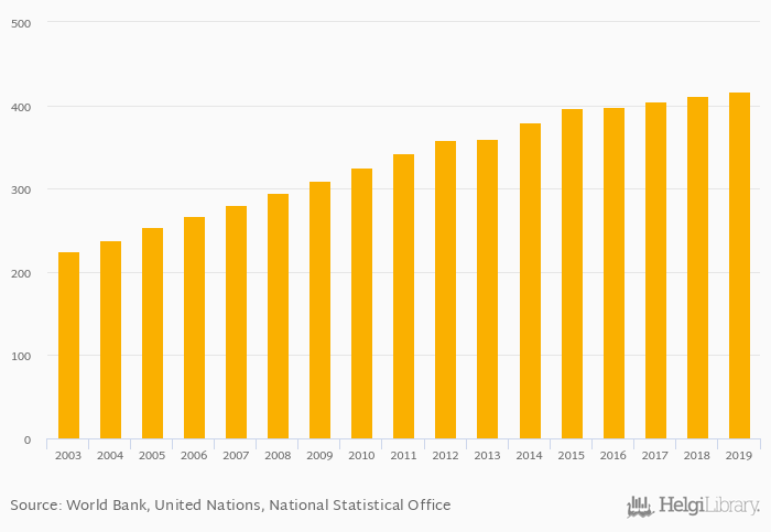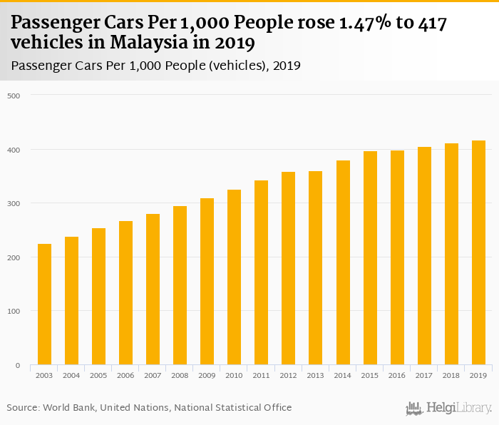 Passenger cars per 1,000 people rose 1.47% to 417 vehicles in Malaysia in 2019, according to the National Statistical Office.