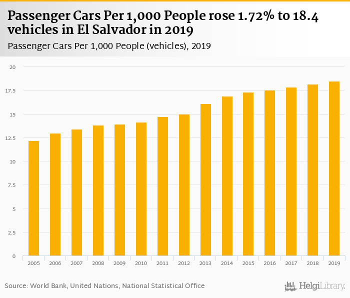 Passenger cars per 1,000 people rose 1.72% to 18.4 vehicles in El Salvador in 2019, according to the National Statistical Office.
