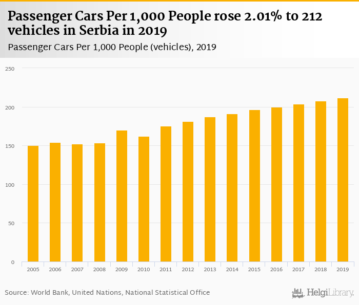 Passenger cars per 1,000 people rose 2.01% to 212 vehicles in Serbia in 2019, according to the National Statistical Office.