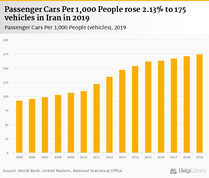 Passenger cars per 1,000 people rose 2.13% to 175 vehicles in Iran in 2019, according to the National Statistical Office.