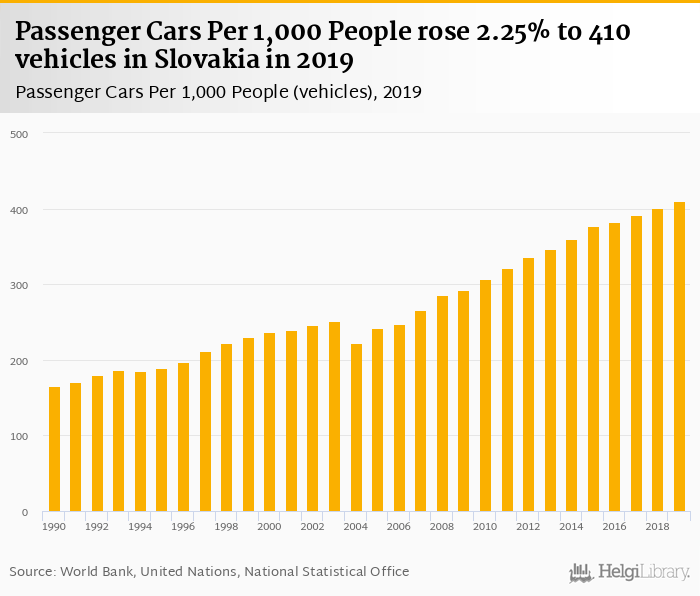 Passenger cars per 1,000 people rose 2.25% to 410 vehicles in Slovakia in 2019, according to the National Statistical Office.
