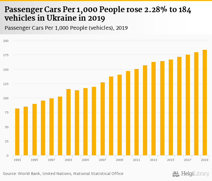 Passenger cars per 1,000 people rose 2.28% to 184 vehicles in Ukraine in 2019, according to the National Statistical Office.