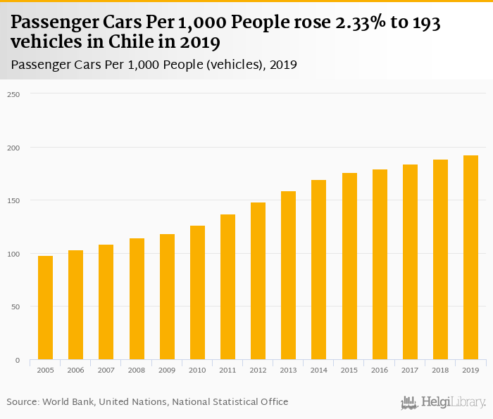 Passenger cars per 1,000 people rose 2.33% to 193 vehicles in Chile in 2019, according to the National Statistical Office.