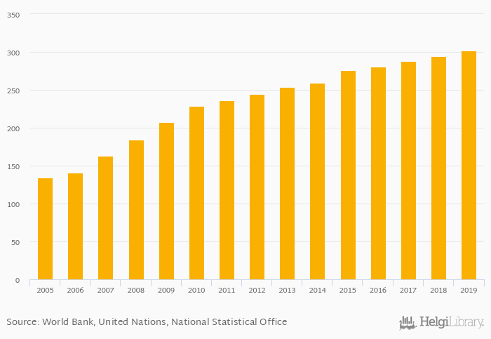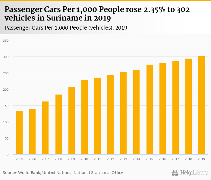 Passenger cars per 1,000 people rose 2.35% to 302 vehicles in Suriname in 2019, according to the National Statistical Office.