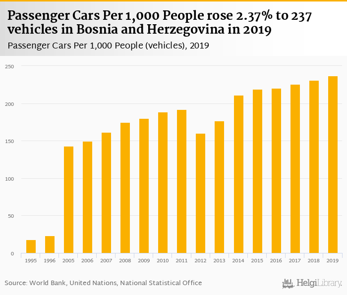 Passenger cars per 1,000 people rose 2.37% to 237 vehicles in Bosnia and Herzegovina in 2019, according to the National Statistical Office.