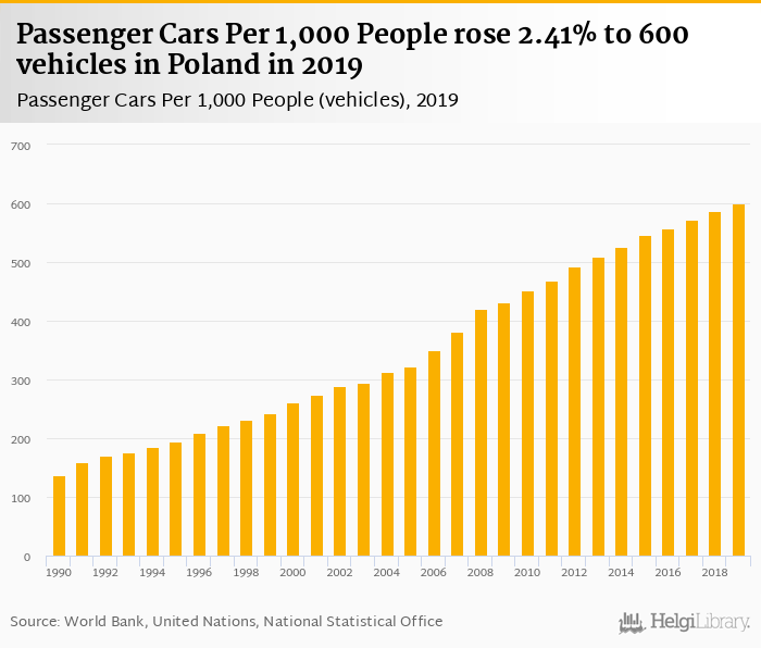 Passenger cars per 1,000 people rose 2.41% to 600 vehicles in Poland in 2019, according to the National Statistical Office.