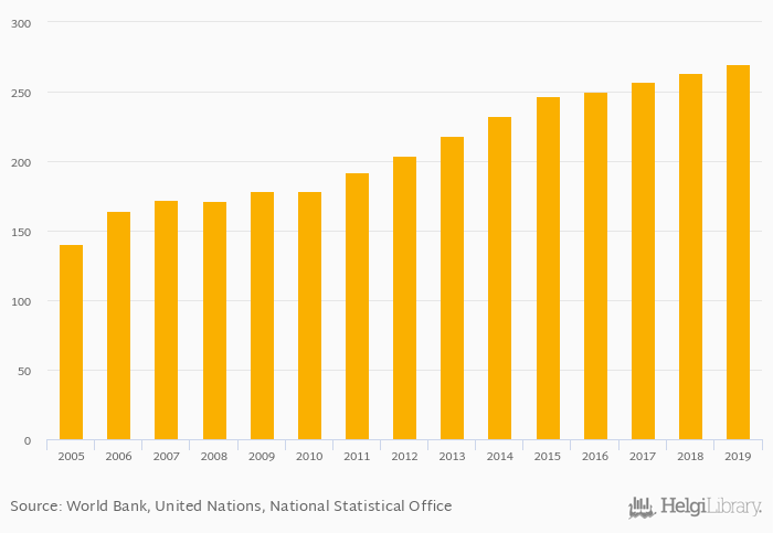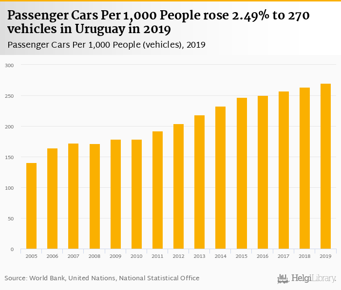 Passenger cars per 1,000 people rose 2.49% to 270 vehicles in Uruguay in 2019, according to the National Statistical Office.