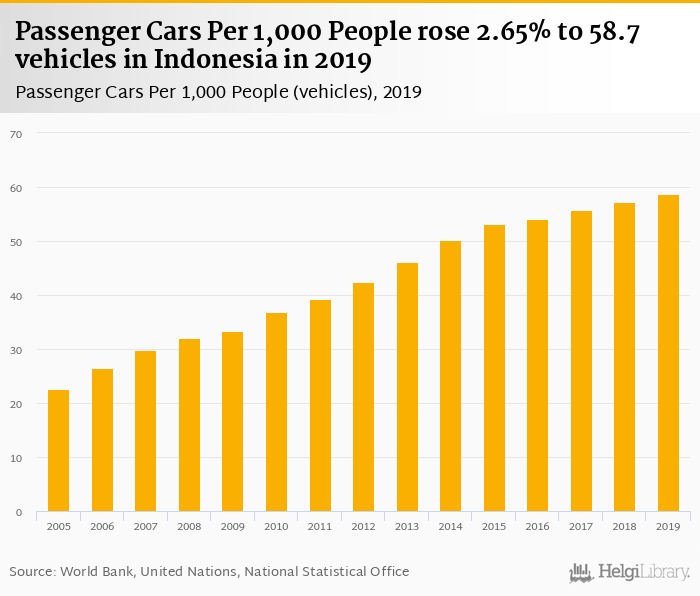Passenger cars per 1,000 people rose 2.65% to 58.7 vehicles in Indonesia in 2019, according to the National Statistical Office.