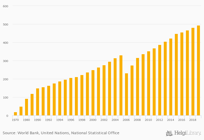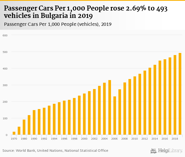 Passenger cars per 1,000 people rose 2.69% to 493 vehicles in Bulgaria in 2019, according to the National Statistical Office.