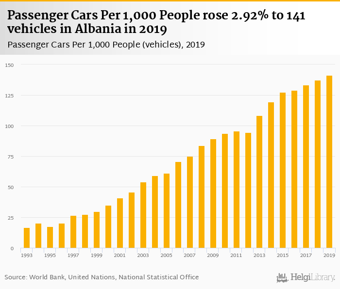 Passenger cars per 1,000 people rose 2.92% to 141 vehicles in Albania in 2019, according to the National Statistical Office.