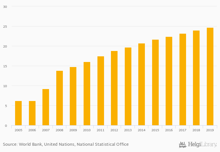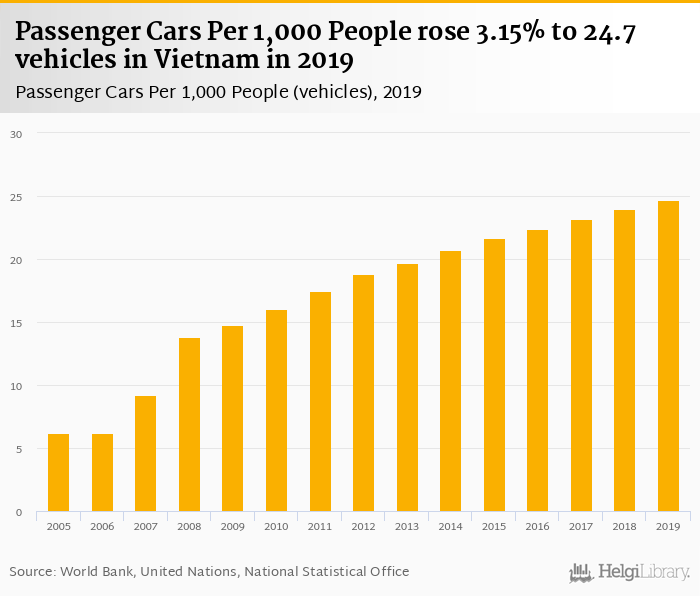Historically, passenger cars per 1,000 people in Vietnam reached an all time high of 24.7 vehicles in 2019 and an all time low of 6.18 vehicles in 2005.