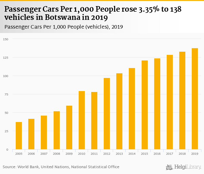 Passenger cars per 1,000 people rose 3.35% to 138 vehicles in Botswana in 2019, according to the National Statistical Office.