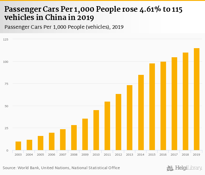Passenger cars per 1,000 people rose 4.61% to 115 vehicles in China in 2019, according to the National Statistical Office.