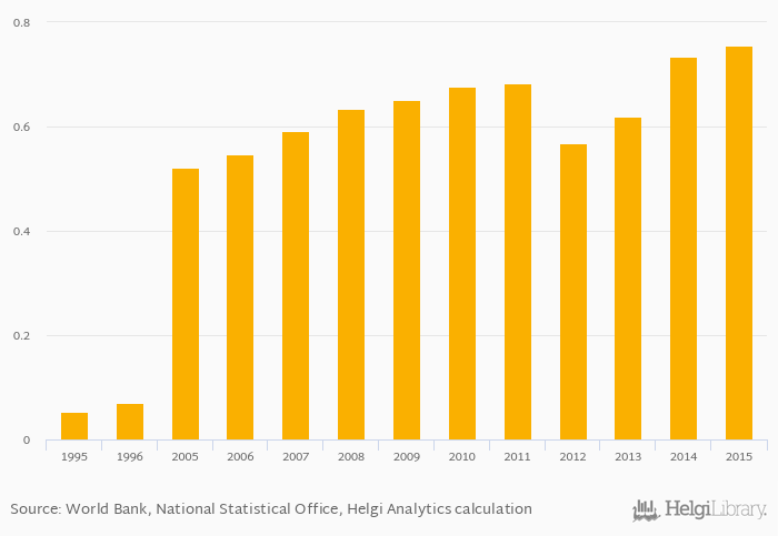 Historically, passenger cars per household in Bosnia and Herzegovina reached an all time high of 0.756 vehicles in 2015 and an all time low of 0.053 vehicles in 1995.