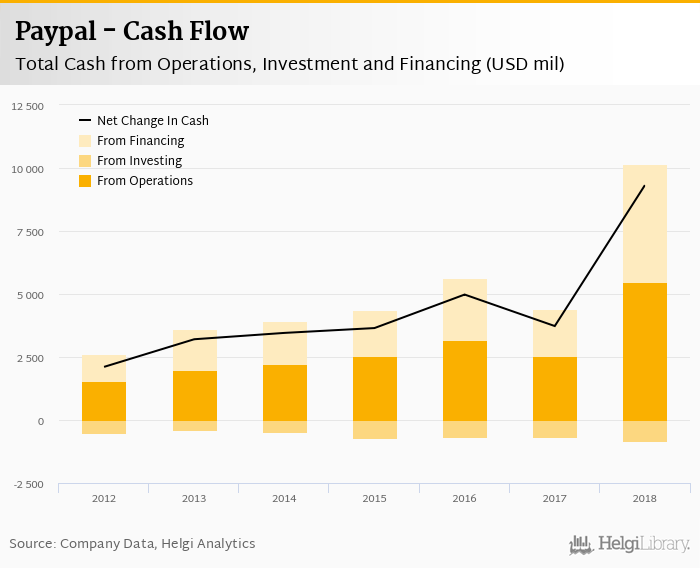 At the end of 2018, the company had a net debt of USD -7,111 mil, or -2.11x of EBITDA and -0.462% of equity. Net working capital amounted to USD -2,031 mil, or -13.1% of sales. The cash conversion cycle stood at -302 days in 2018. This is an improvement compared to the previous year (-331 days), so Paypal’s working capital was tied up for 29.1 fewer days.