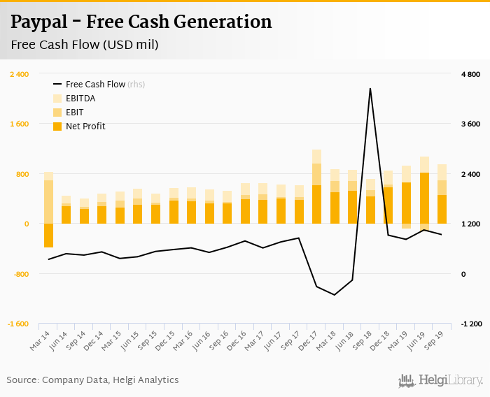 Paypal made a net profit of USD 462 mil with revenues of USD 4,378 mil in 3Q2019, up by 5.96% and up by 18.9%, respectively, compared to the previous year. This translates into a net margin of 14.9%.