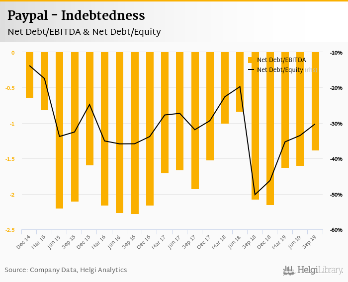 Paypal's net debt stood at USD -4,985 mil and accounted for -30.2% of equity at the end of 3Q2019. The ratio is up 20.0 pp compared to the previous year.