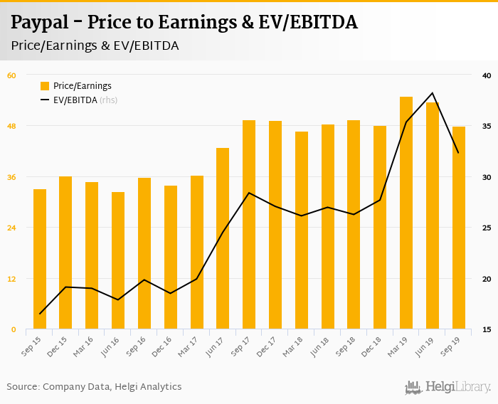 Paypal stock traded at USD 102 per share at the end 3Q2019 translating into a market capitalization of USD 121,615 mil.