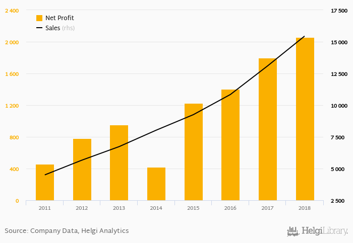 Sales have grown by 18.1% a year on average since 2013. They reached a high of USD 15,451 mil in 2018 and a low of USD 4,499 mil in 2011.