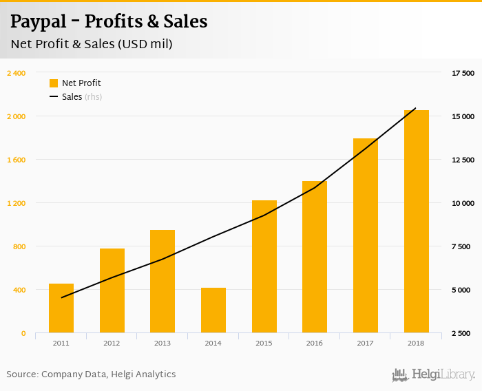 Paypal made a net profit of USD 2,057 mil in 2018, up 14.6% compared to the previous year. Total sales reached USD 15,451 mil, which is up 18% when compared to the previous year.