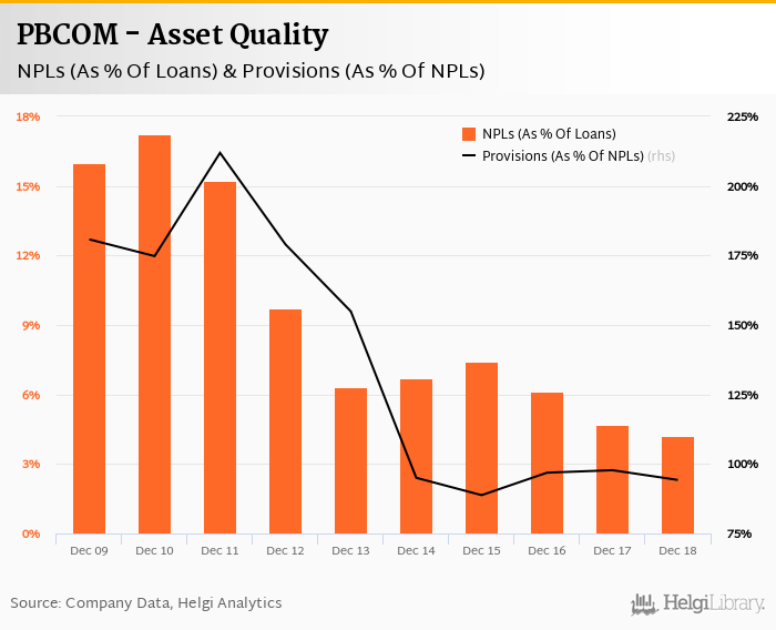 PBCOM's non-performing loans reached 4.19% of total loans at the end of 2018-12-31, down from 4.70% compared to the previous year. Historically, the NPL ratio hit an all time high of 17.3% in 2010-12-31 and an all time low of 4.19% in 2018-12-31.