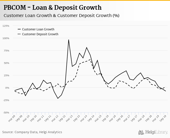 PBCOM's customer loan growth reached -7.41% in 2019-09-30, down from 15.6% compared to the previous year. Historically, the bank’s loans growth reached an all time high of 96.4% in 2012-12-31 and an all time low of -22.1% in 2012-03-31. In the last decade, the average annual loan growth amounted to 16.8%.