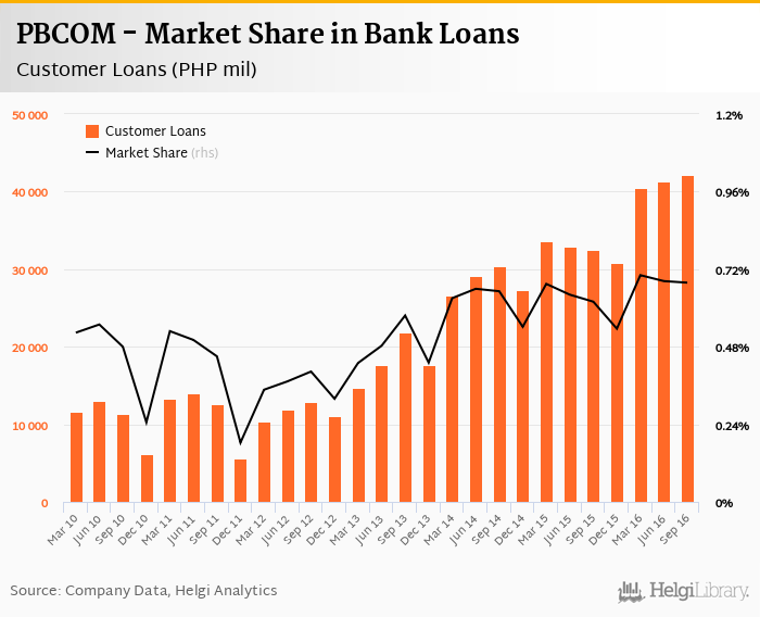 PBCOM's customer loans reached PHP 42,171 mil in 2016-09-30, up 2.16% compared to the previous year.