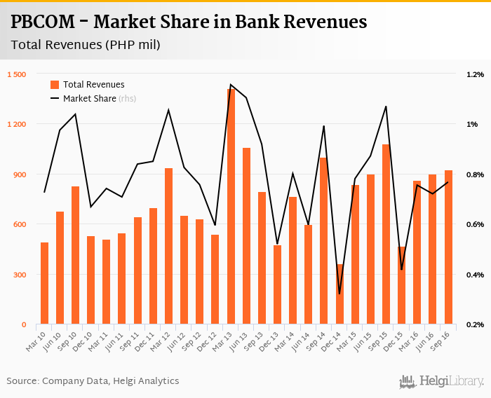 PBCOM generated total banking revenues of PHP 926 mil in 2016-09-30, up 3.11% compared to the previous year.
