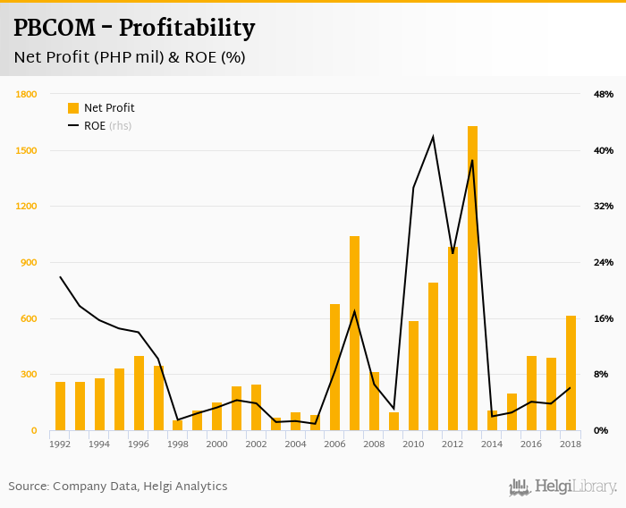 PBCOM made a net profit of PHP 618 mil in 2018, up 57.5% compared to the previous year. This implies a return on equity of 6.10%.