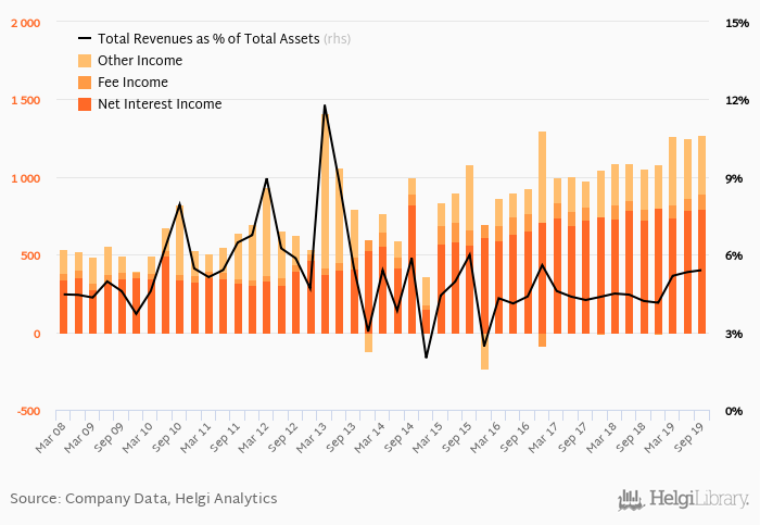 Net interest income represented 62.4% of total revenues, fee income contributed 7.64% and other non-interest income added further 29.9% to the overall revenue generation in 3Q2019.