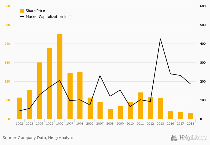 Since the end of 2013, the stock has depreciated by -70.3 % implying an annual average growth of -21.6 %. In absolute terms, the value of the company fell by USD -241 mil.