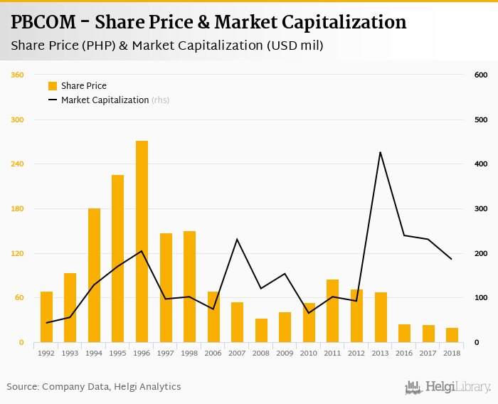 PBCOM stock traded at PHP 20.2 per share at the end of 2018 implying a market capitalization of USD 185 mil.