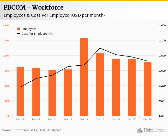 PBCOM employed 1,074 persons in 2018-12-31, down 0% when compared to the previous year. Historically, the bank's workforce hit an all time high of 1,544 persons in 2014-12-31 and an all time low of 919 in 2010-12-31.