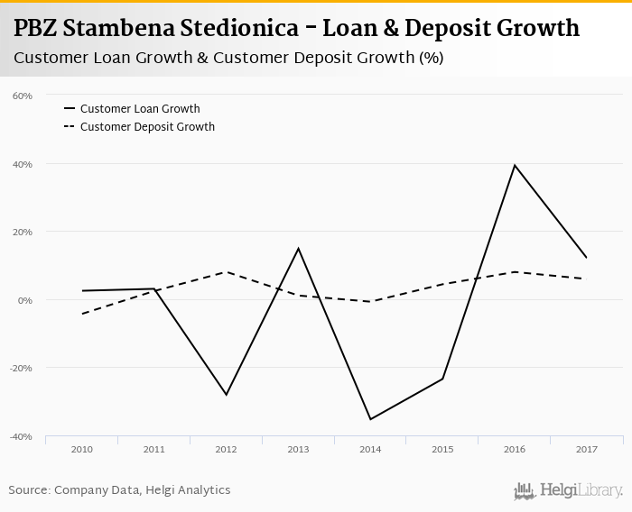 PBZ Stambena Stedionica's customer loan growth reached 12.0% in 2017, down from 39.2% compared to the previous year. Historically, the bank’s loans growth reached an all time high of 8,232% in 2009 and an all time low of -35.3% in 2014. In the last decade, the average annual loan growth amounted to 0%.