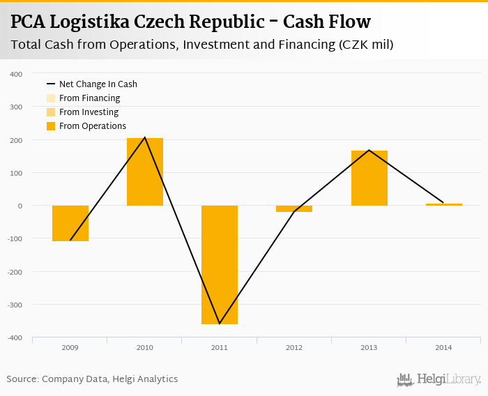 Cash from financing amounted to CZK 0 mil, so the company generated CZK 6.31 mil net cash in 2014.