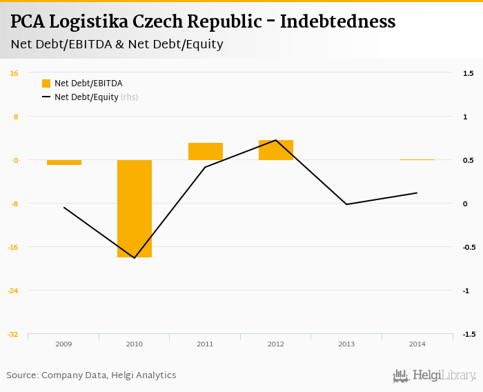 PCA Logistika Czech Republic's net debt stood at CZK 21.9 mil and accounted for 0.115 of equity at the end of 2014. The ratio is up 0.133 pp compared to the previous year.