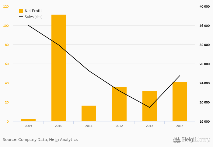 Sales have fallen by 6.65% a year on average since 2009. They reached a high of CZK 35,994 mil in 2009 and a low of CZK 18,862 mil in 2013.