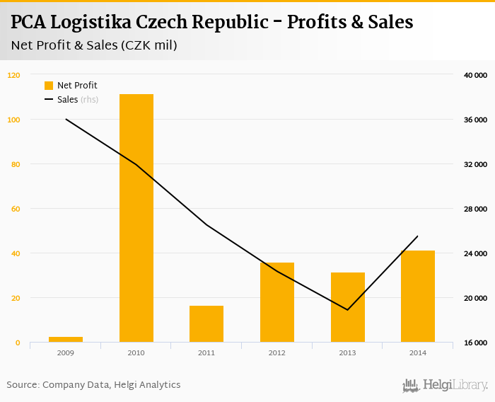 PCA Logistika Czech Republic made a net profit of CZK 41.3 mil in 2014, up 31.7% compared to the previous year. Total sales reached CZK 25,514 mil, which is up 35.3% when compared to the previous year.