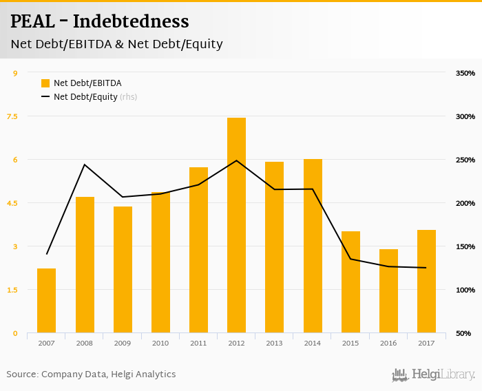 PEAL's net debt stood at CZK 164 mil and accounted for 125% of equity at the end of 2017. The ratio is down 1.32 pp compared to the previous year.