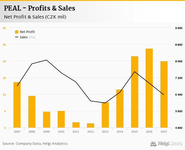 PEAL made a net profit of CZK 24.0 mil in 2017, down 16% compared to the previous year. Total sales reached CZK 6,370 mil, which is down 8.17% when compared to the previous year.