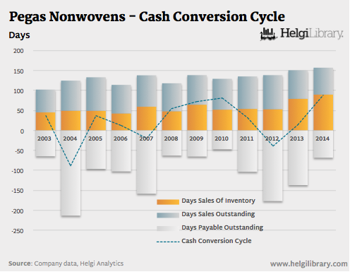 Being a supplier of large multinational conglomerates, Pegas must finance heavily its working capital needs. In 2014, the Company got paid 5 months after buying its material, while it had to pay to its suppliers 3 months after their delivery, on average.