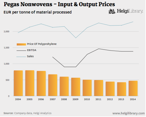 Pegas contracts production volumes on an average 1-2 year basis and is paid a conversion margin plus the cost of it main raw materials - polypropylene and polyethylene plastic. Its growth on European markets is constrained by demand growth for hygiene products, which a relatively mature market overall.