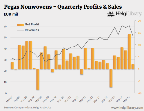Pegas Nonwovens is Europe’s second largest producers of nonwoven fabric for hygiene application (diapers, feminine hygiene, and adult incontinence). Based in Znojmo in the Czech Republic, the company produced over 100,000 tonnes of fabric in 2014. Since 2005, the Company's revenues have grown 11.1% a year on average to over EUR 230 mil. The share of high-tech products increased from 5% in 2003 to 12% in 2014. Central Europe remains the key market for Company's products with 42% of total sales followed by Western Europe with a third of its products sold. The data presented in the chart could be downloaded in the Companies section.