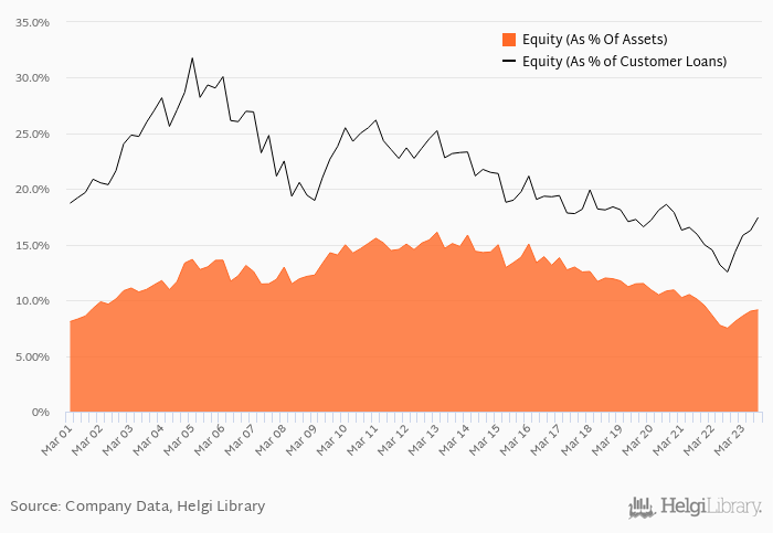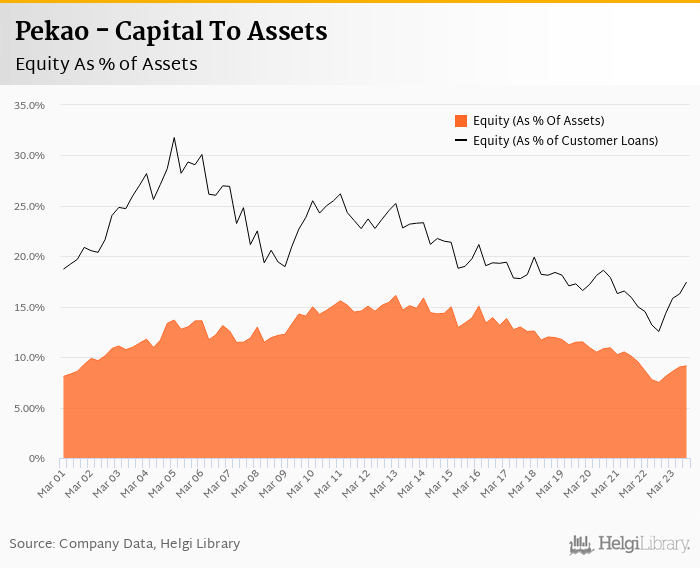 Pekao's Equity reached 9.14% of total assets in the 3Q2023, up from 7.49% for the previous year. As a share of net customer loans, the ratio amounted to 17.4% at the end of the third quarter of 2023.