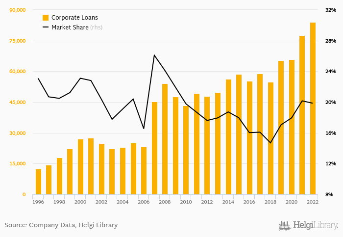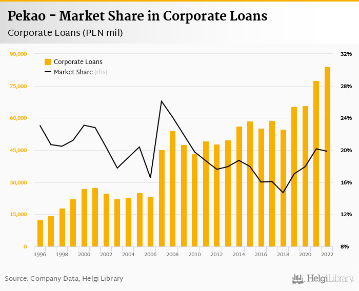 Pekao accounted for 19.9% of all corporate loans issued in Poland at the end of 2022. Historically, the bank’s market share in corporate loans reached an all time high of 26.1% in 2007 and an all time low of 14.7% in 2018.