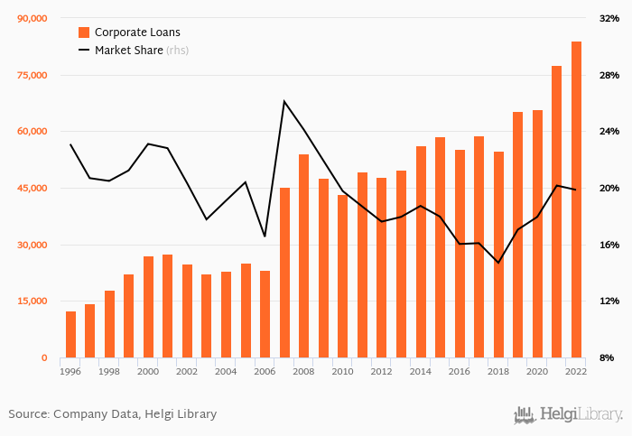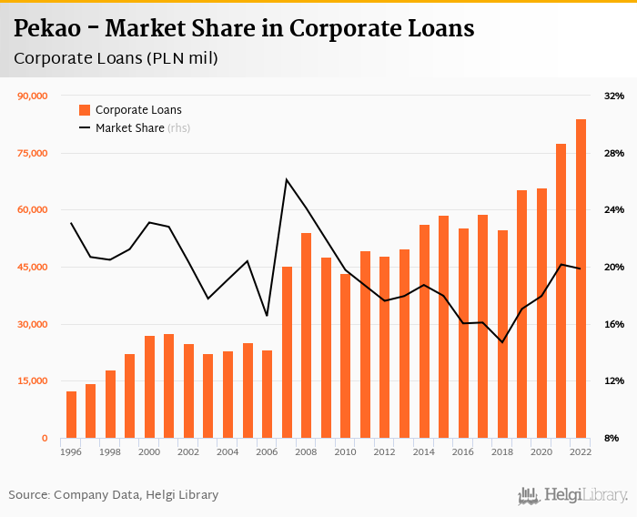 Pekao accounted for 19.9% of all corporate loans issued in Poland at the end of 2022. Historically, the bank’s market share in corporate loans reached an all time high of 26.1% in 2007 and an all time low of 14.7% in 2018.
