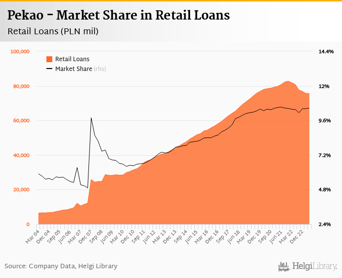 Pekao accounted for 10.5% of all retail loans issued in Poland at the end of 2Q2023. Historically, the bank’s market share in retail loans reached an all time high of 10.5% in 2Q2021 and an all time low of 4.92% in 3Q2007.