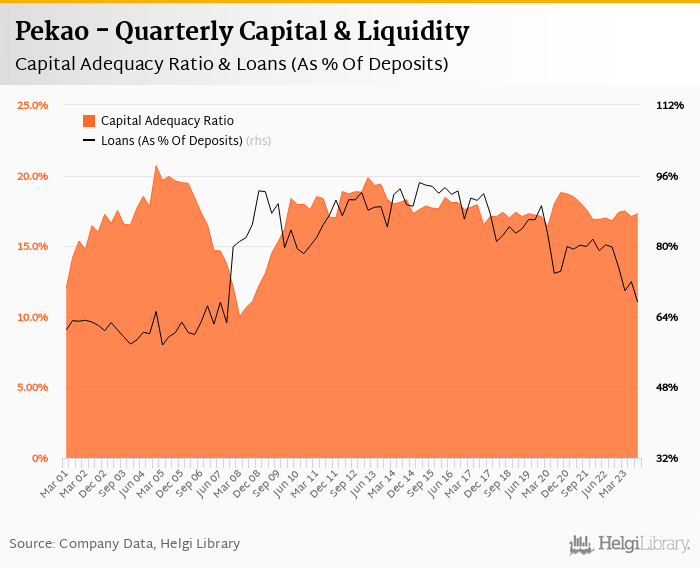 Pekao's capital adequacy ratio reached 17.3% at the end of third quarter of 2023, up from 17.1% when compared to the previous quarter. Historically, the bank’s capital ratio hit an all time high of 20.7% in 4Q2004 and an all time low of 10.0% in 1Q2008.